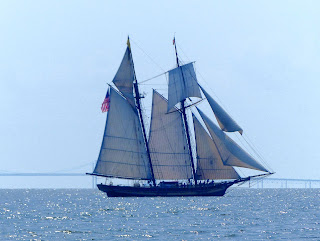 | The Pride of Baltimore with the Bay Bridge in the background, welcomes us to the Chesapeake. |
